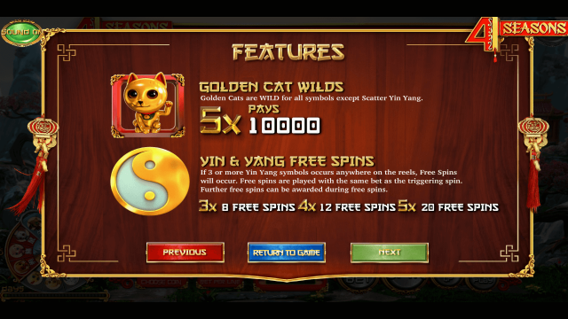 Преимущества видеослота — разнообразие бонусных режимов. Помимо бонусов, в автомате есть спецсимвол Вайлд, который заменяет другие изображения, кроме знака Инь-Янь. Удвоить выплату можно в рисковой игре. Очередной бонус может выпасть в любом спине.
